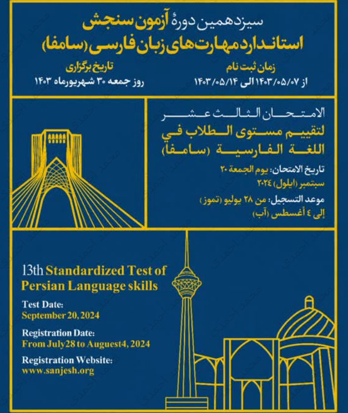 آزمون سنجش تواناییهای زبان فارسی (سامفا) در 30شهریور برابر با 20 سپتامبر 2024 برگزار خواهد شد.