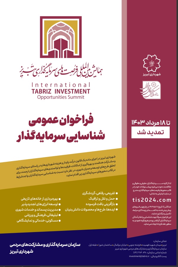علاقمندان به سرمایه گذاری در شهر تبریز ، میتوانند پیشنهادات خود را در قالب محورها و فرصت های سرمایه گذاری مندرج در پایگاه اینترنتی tis2024.com حداکثر تا تاریخ 18 مرداد ماه سالجاری مطابق با 8 آگوست 2024 به همراه مدارک و سوابق کاری در فرم های موجود در پایگاه اینترنتی فوق تکمیل و ارسال نمایند.